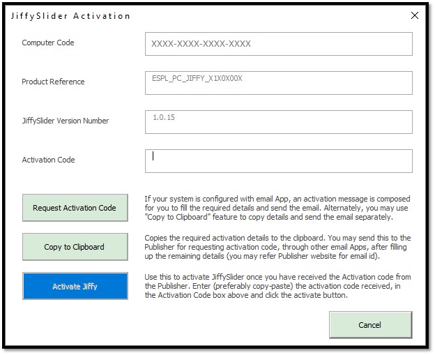 To continue with uninterrupted use of JiffySlider beyond the trial period, you need to activate the Product. Beyond the trial period, JiffySlider is configured to work with an activation code that is specifically generated for the system on which it is installed.