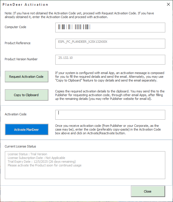 To continue with uninterrupted use of PlanDeer beyond the trial period, you need to activate the Product. Please find below, the steps to be followed to obtain the Activation Code and activate PlanDeer.